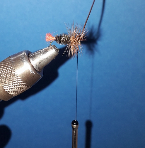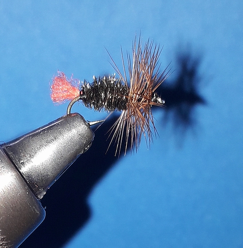 Das „Orscherl“ kann auf verschiedene Arten gebunden werden, eher als Palmer oder aber als Hechelfliege. Wichtig ist immer die Verdickung am Hakenbogen. Meine Variante mit Grizzlyhechel funktioniert bei uns an der Donau zuverlässig. Man kann auch eine braune Hechel verwenden. Material: