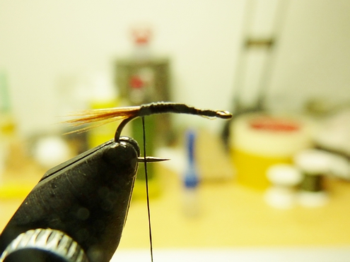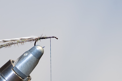 (5) Die Softhackle um den Haken winden und fixieren. Abschließend mit dem Kopfknoten den Faden zusätzlich sichern. |