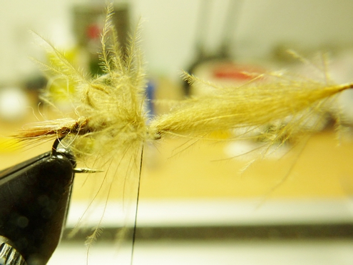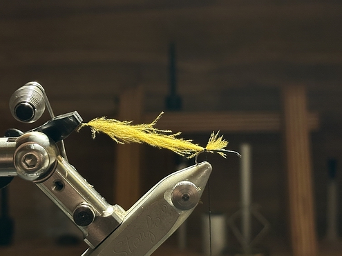 Beim Einholen soll ein Yellow Spider langsam, aber mit variierender Geschwindigkeit eingeholt werden. Die hier vorgestellte Version ist eine Variation aus einem dünnen, irisierendem Effektgarn (z.B. Madeira Metallic), feinem bräunlichen Dubbing für den Thorax und kleinen Flankenfedern der Stockente. Die Federn sind in diesem Fall naturfarben, sie können aber auch gelb gefärbt gut eingesetzt werden. Material: