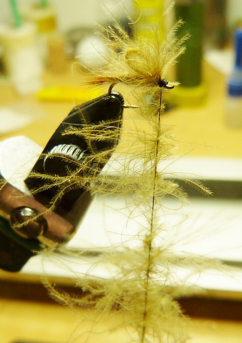 6. Mit dem Bindefaden eine Schlaufe legen und die Fibern einer halben CDC Feder mittels Klammer in die Schlaufe übertragen und zu einem Strang verdrehen. Die Pfauenfiber vorsichtig (damit sie nicht abreißt) mit dem CDC Strang verdrillen. 7. Nun eine braune Hahnenhechel (die Fibern sollten