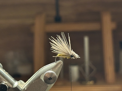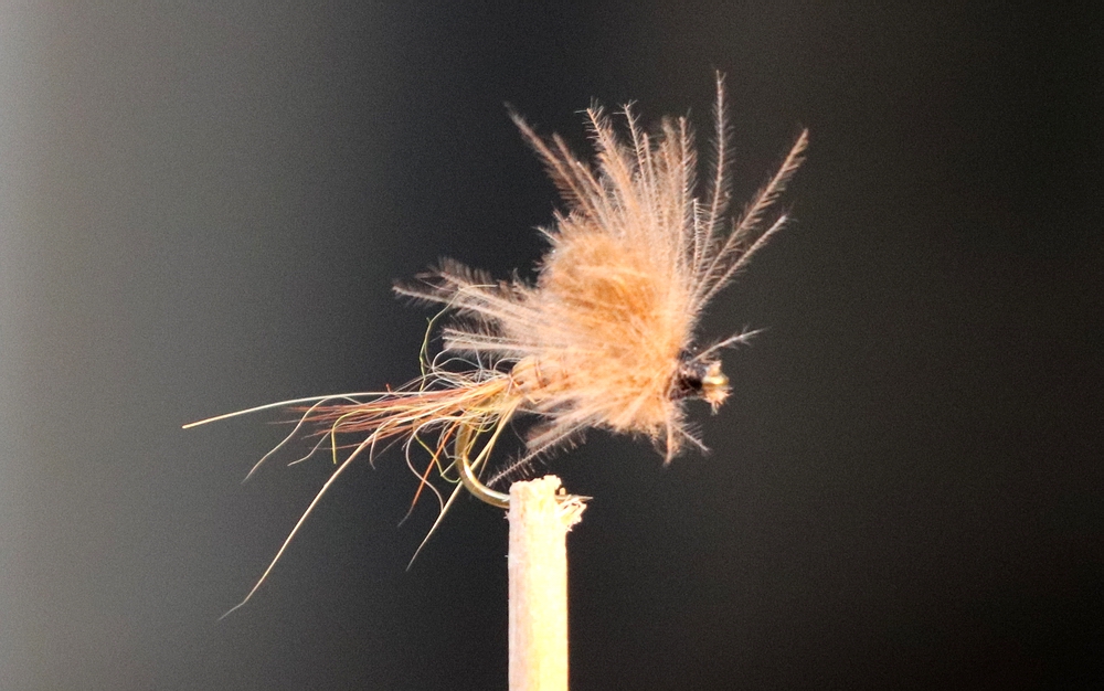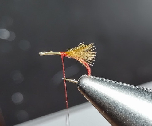 Ich nehme einen kurzschenkligen, Emerger bzw. Trocfliegenhaken, hier den TMC 2488 in #14, der Widerhaken wird angedrückt. Eine Grundwicklung mit einem gut spleissbaren, schwarzen Faden, hier ein Veevus in 8/0 bildet die Basis. In diesem Zuge binde ich einige Fibern einer braunen Hahnenhechel als Schwänzchen ein, dazu ein Stück feinen Kupferdraht als Rippung für den Körper. Der Faden wird gespleisst und etwas hellbraunes Glitzerdubbing damit versponnen. Den Dubbindstrang auf ca. 2/3 des Hakenschenkels wickeln und mit dem Kupferdraht rippen. Jetzt eine schöne CDC-Feder an der Spitze einbinden, in einem Bogen einbinden und vorne solange anziehen, bis die Größe des Loops passt, dann abbinden und den Federrest abschneiden. Anschließend einige Fibern einer 2. CDC-Feder in einer Klemme bevorraten, den Faden erneut spleissen und die CDC-Fibern mit dem Faden zu einer "Flaschenbürstenform" versponnen. Das ganze dann abwechseln hinter und vor den Loopwing um den Schenkel winden und an Ende der Fliege ein schönes Köpfchen verpassen. Nach Möglichkeit sollten alle Fibern aus dem Abschlussknoten raus bleiben, funktioniert leider nicht immer... Ein Tropfen Lack sichert das Ganze und die Bindearbeit ist erstmal fertig. Zum Schluss werden die Fibern auf der Unterseite der Fliege bündig gekürzt um eine korrekte Schwimmlage sicher zu stellen. Überlange Fibern werden ebenfalls passend eingekürzt, die Fliege ist fertig... Reinhard |