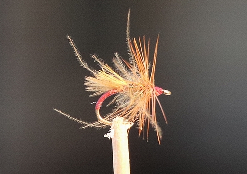 Haken: TMC 2488 #14 Faden: rot (UNI 8/0) Schwanz: CDC Tag: SLS Hanks in Amber Körper: Pfauenfieber und CDC Hechel: braune Hahnennechel Bindeanleitung: |