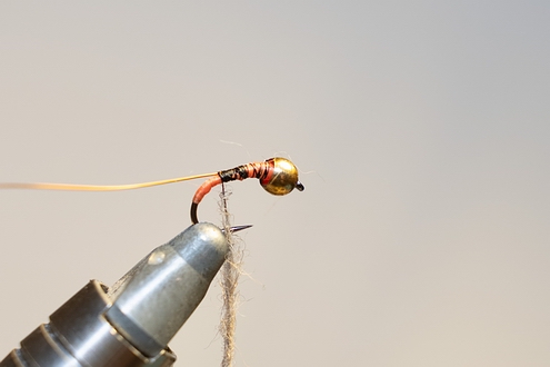 | 5. Mit Dubbing Körper formen und hinter Kopfperle fixieren. | 6. Mit Kupferdraht eine Rippung anbringen, Draht fixieren und abschneiden. |