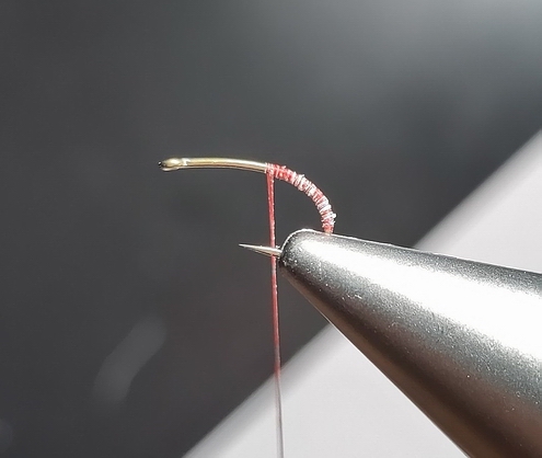 | 1. Bindfaden auf Höhe der Hakenspitze anlegen