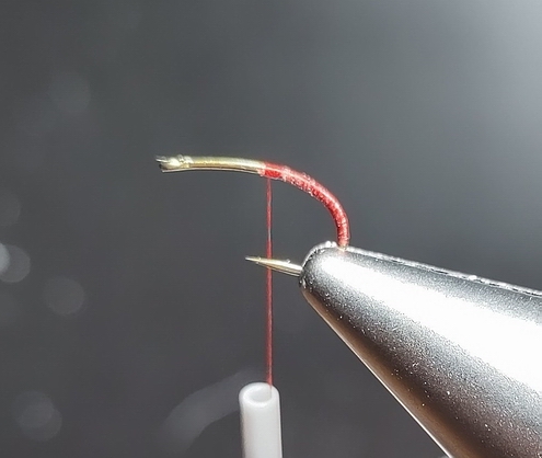| 1. Jighaken, hier Gr. 14, mit einer Kopfperle 3,5 mm versehen und einspannen. | 2. Roten Faden anwinden… |