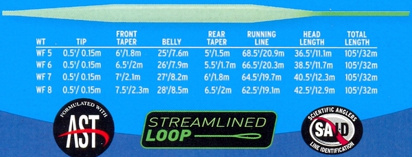 | Klassifizierung: | Die ersten 9,14 Schnurmeter wiegen 13,0 Gramm, das Gewicht liegt damit nach der AFTMA-Tabelle eine halbe Klasse über #7. Das Gewicht der gesamten, 12,10 m langen Keule (inklusive Rear Taper) beträgt 16,7 Gramm. |