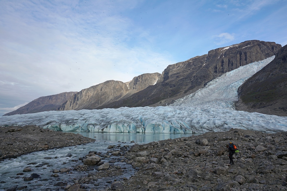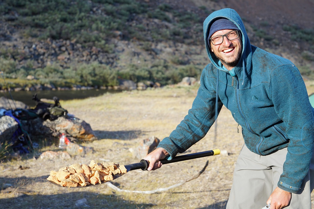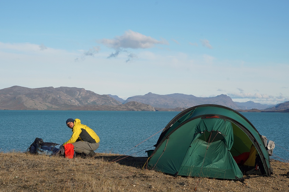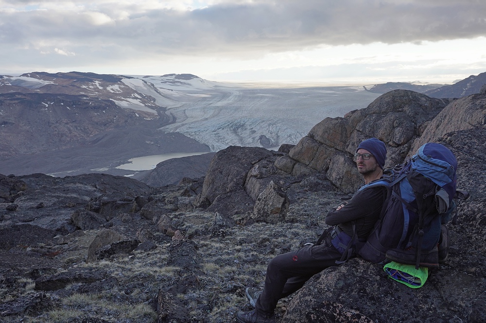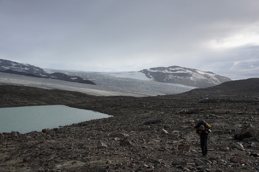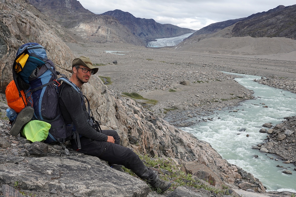 Zwar ist es schon äußerst interessant, im Vergleich zur Etappe im „Ewigkeitsfjord“ (siehe erster Teil des Reiseberichts) eine so extreme Metamorphose durchzulaufen. Die Bootsstrecke bis hierher zum hintersten Fjord-Ende glich Slacklinen auf der schmalen Uferlinie zwischen den eiskalten Tiefen des Fjordes und den senkrechten Felswänden und Hängegletschern. Bei der weiteren Fortbewegung auf dem nacheiszeitlich steinigen Parcours ins Hinterland fühlen wir uns hingegen eher wie schwer beladene Landschildkröten. Doch leider ist dieser Wechsel mit einem massiven Verlust an Lebensqualität verbunden – trug die Last bisher das Meer und der Wind half mit, so tun wir’s nun selbst. Mit Boot, Zelt, Proviant für weitere zweieinhalb Wochen, Foto- und Fischereiausrüstung etc. wuchtet jeder von uns deutlich über 40 kg. Glücklicherweise kennen wir diese Leiden schon und wissen: Mit jedem Tag wird’s besser. Und mantra-artig wiederholt Jakob ironisch: „Die Lust am Wandern kommt beim Wandern“. |