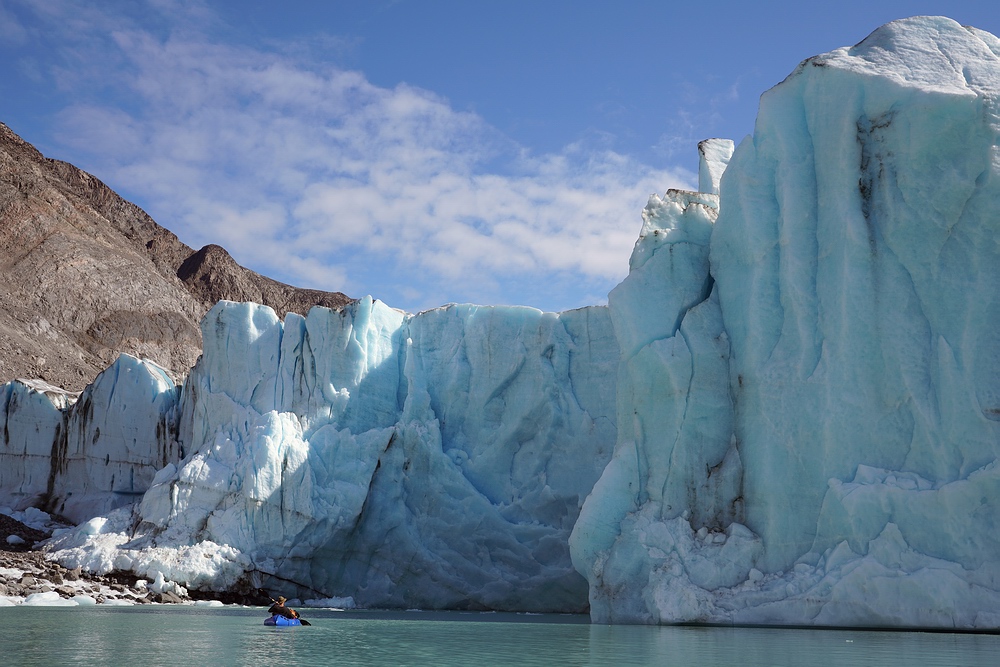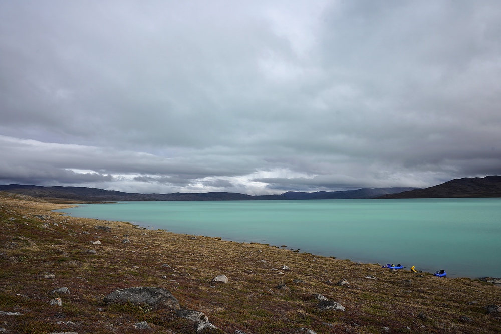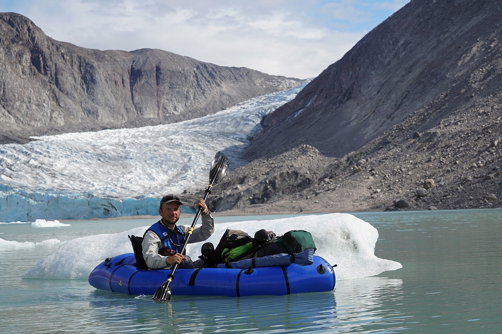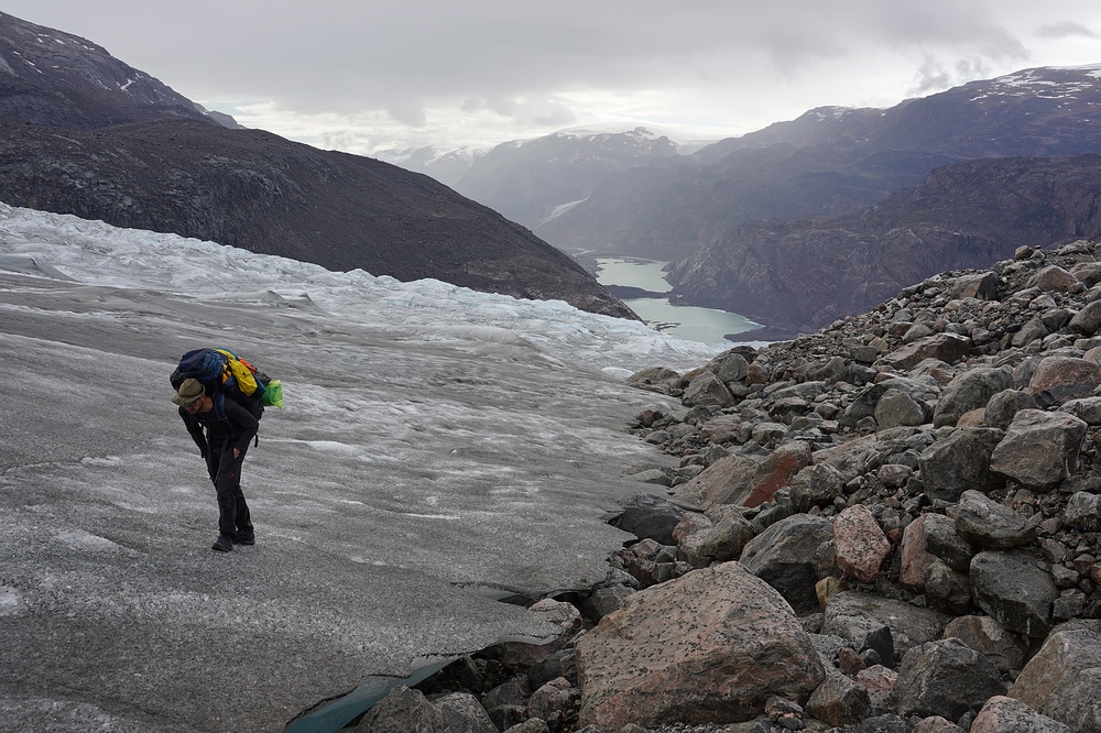 | Am dritten Tag erreichen wir den Talschluss. Leider ist hier kein einfacher Weg frei, sodass wir uns über eine besonders üble Seitenmoräne ein Stück hoch kämpfen müssen, bevor wir den eigentlichen Gletscher betreten können. Doch dieser fließt mit recht gemäßigtem Gefälle vom Inlandeis herunter und dient uns als Eintrittspforte zum Hochland. Bei einsetzendem Regen stellen uns steilere Abschnitte und ins Eis eingeschnittene Gletscherbäche mit rutschigen Böschungen noch vor Herausforderungen, bevor wir am frühen Abend das Hochplateau erreichen und unsere „Hufe“ wieder vom Eis lösen. Wieder über Moränen und gerade vom Eis freigegebenes Gelände erreichen wir endlich Seen, die sich mit den Packrafts weit müheloser durchqueren lassen. Hier tummeln sich eine Menge „Urzeitkrebse“ (Feenkrebse und Kiemenfußkrebse), was dafürspricht, dass in diesen flachen Gewässer keine Fische als Fressfeinde vorkommen. Dann noch ca. 20 km stromab auf einem weiteren Fluß-Seen-System paddeln, bis eine weitere Schlüsseletappe folgt – die nächsten Tage werden wir über einen zerklüfteten Gebirgszug zum so genannten „Paradiestal“ marschieren. |