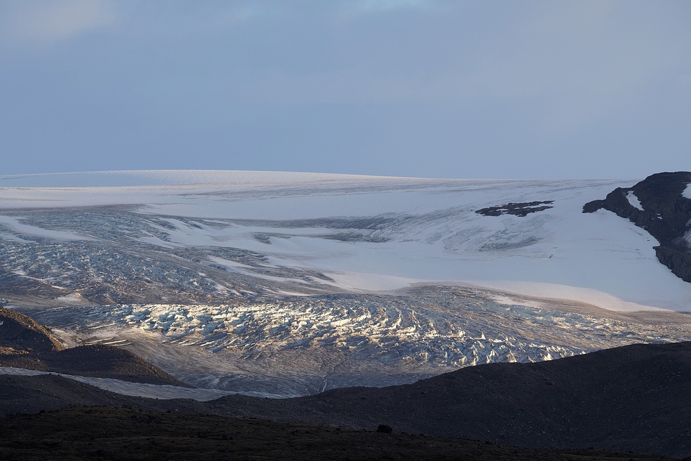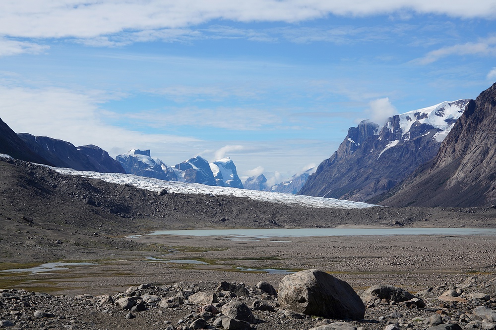 | Laut einer Karte aus den 1960er Jahren war das Ende dieses Fjordes damals noch über weite Strecken mit Eis gefüllt, unser heutiger Weg wäre also unmöglich zu bewältigen gewesen. Die Gletscherzungen in diesem Gebiet haben im letzten Jahrhundert im Mittel etwa einen Kilometer an Länge eingebüßt. Wir befinden uns also auf Land, das erst vor einigen Jahrzehnten vom Eis freigegeben wurde. Natürlich ist es etwas inkonsequent, als mit dem Flugzeug unter enormem CO2 Ausstoß angereister Tourist über dieses Thema zu referieren. Trotzdem sollte nicht unerwähnt bleiben, dass sich der Klimawandel in diesen arktischen Regionen besonders drastisch auswirkt. |