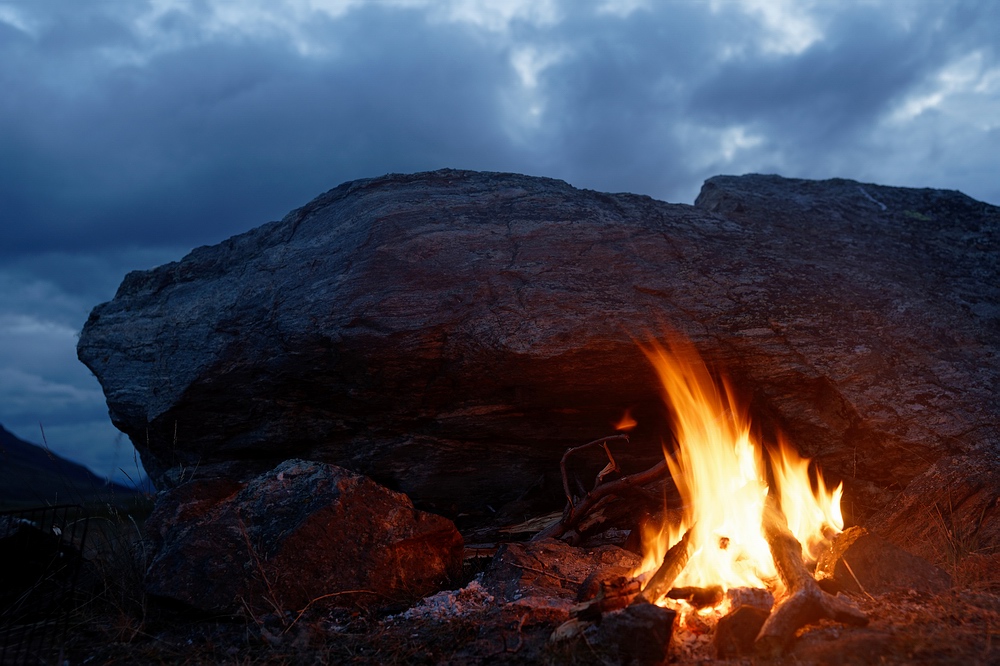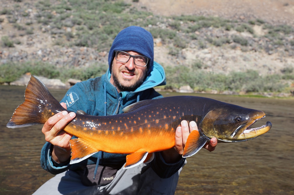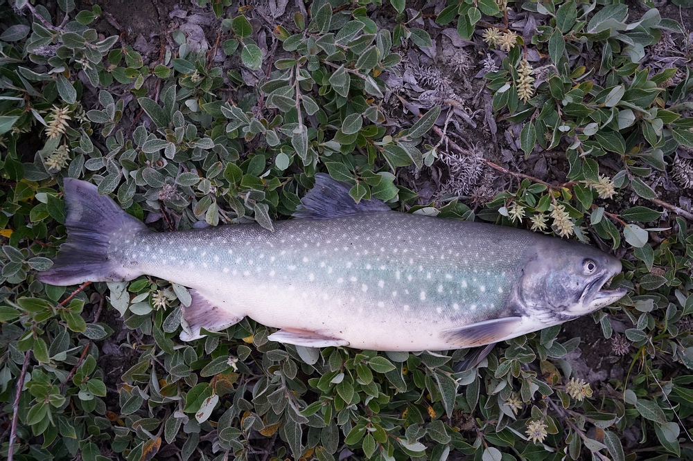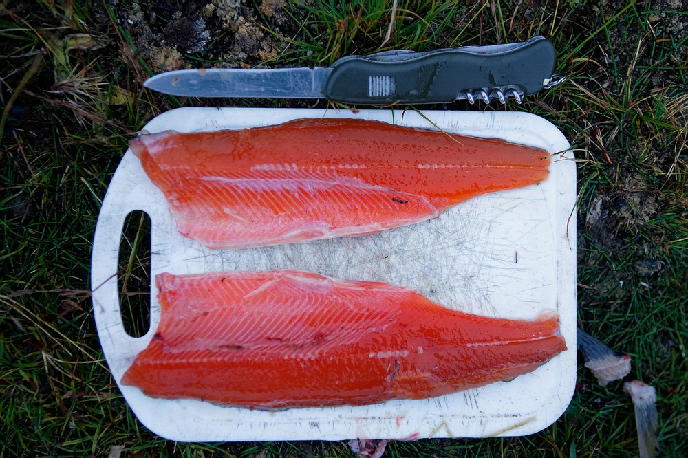 | Nach zwei langen Marschtagen durch die hügelige Tundra erreichen wir eine Seenkette und fangen dort ganzjährig im Süßwasser (resident) lebende Saiblinge bis etwa 35 cm Länge. Ihre Mägen sind prall mit roten Daphnien gefüllt, sodass es nicht verwundert, dass auch ihre Filets so intensiv knallrot sind, wie ich das kaum zuvor gesehen habe. Sie schmecken unfassbar gut, noch deutlich besser als die vorwiegend Fisch fressenden Wandersaiblinge! |
