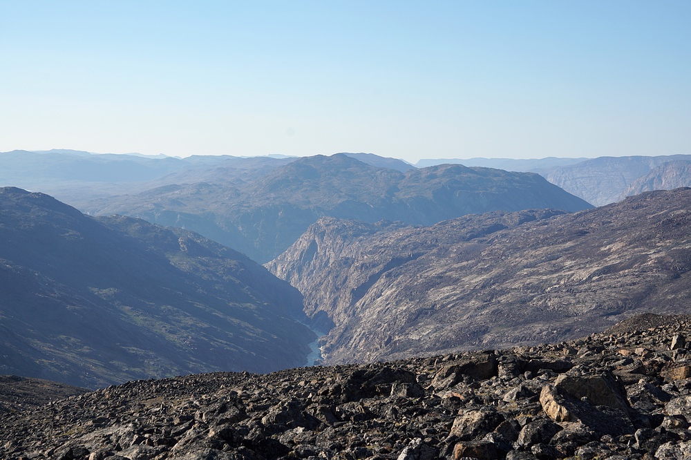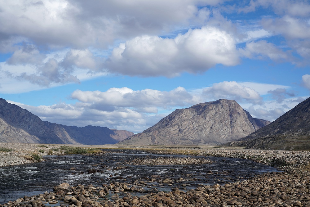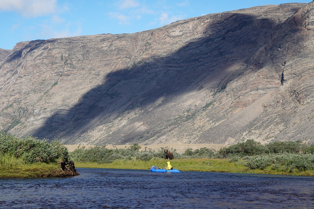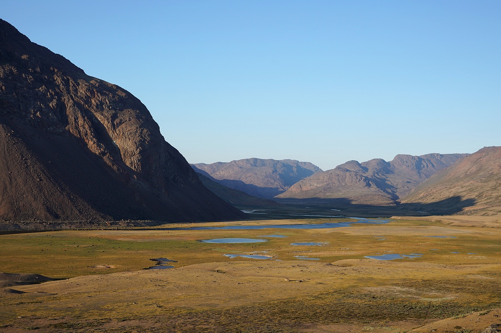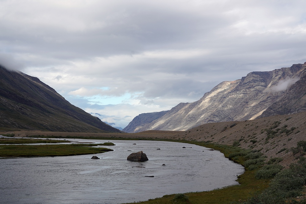 | Nach ein paar Tagen Fischerei und Erholung von den Strapazen der Marschetappe planen wir einen Ausflug zur Mündung „unseres Flusses“ in den Sarfartoq. Wir wollen mit den Packrafts stromab fahren und retour marschieren. Doch leider ist der Gegenwind so stark, dass wir kaum vom Fleck kommen, das Boot nach einigen Kilometern zurücklassen und auch den Weg stromab zu Fuß bewältigen. Auf der Strecke durch das beeindruckende Tal sichten wir zwei Gruppen von Rentieren und unzählige Moschusochsen. |