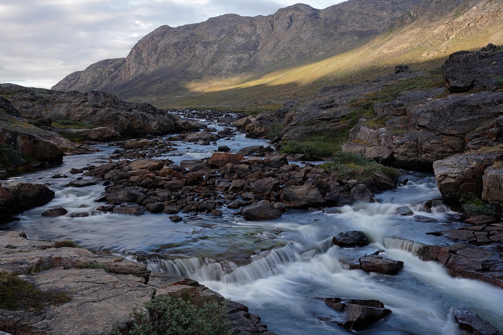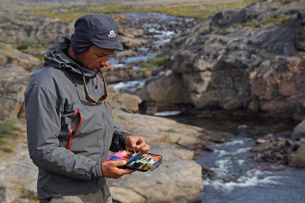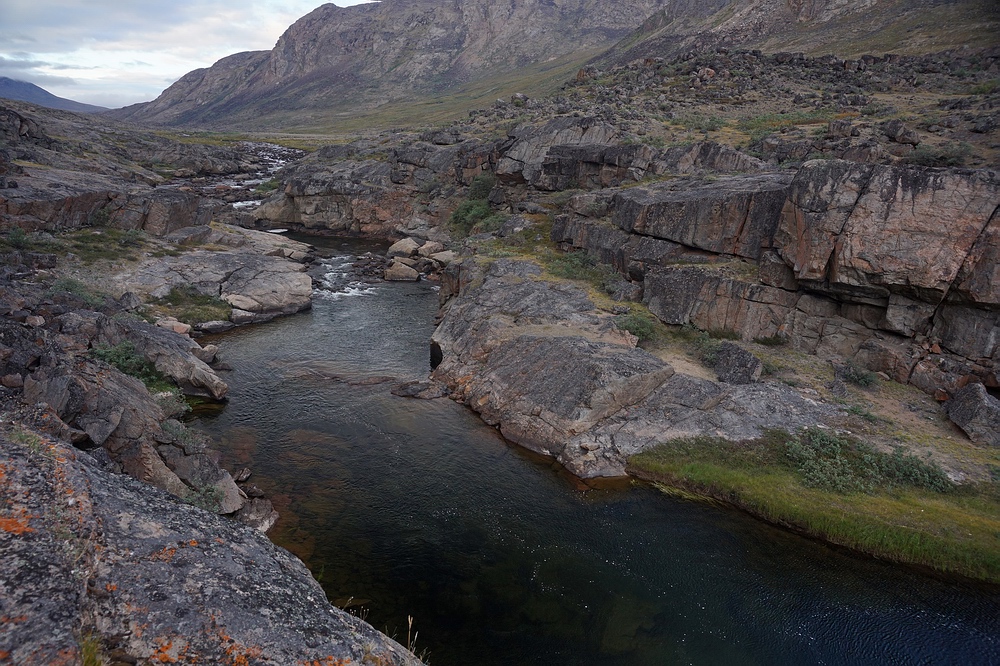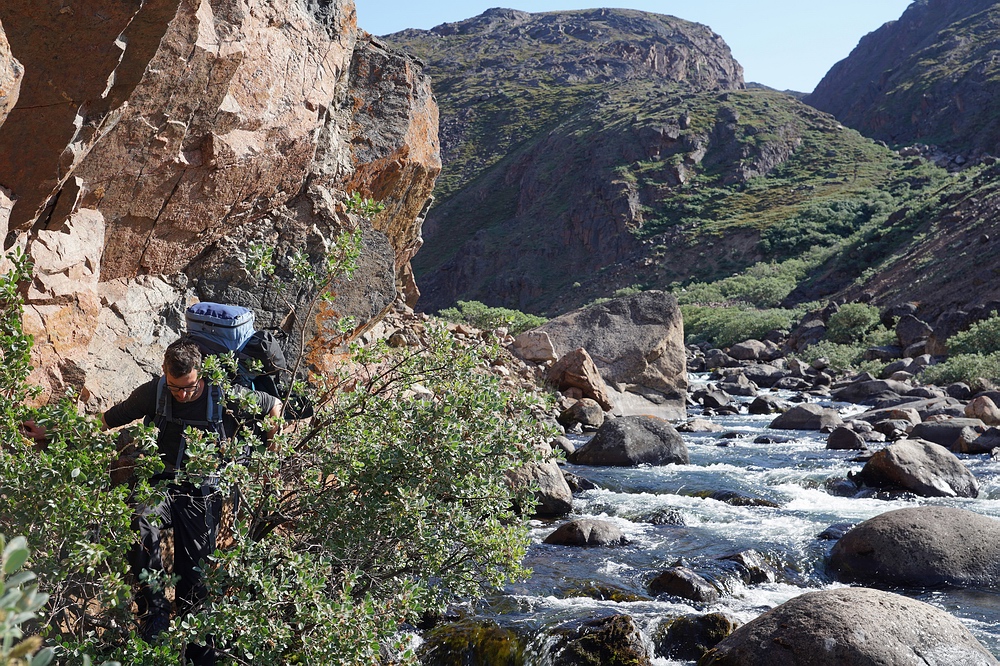 An der Nordseite wird der Gebirgsstock von steilen Bachschluchten durchschnitten, in die uns grasige und steinige Böschungen hinunter führen. Bäume gibt es auf Grönland nicht. Wohl fanden wir an wenigen, gut geschützten Stellen im Fjord Erlenbüsche und hier in den Tälern Weidengestrüppe mit armdicken Ästen. Durch diese schinden wir uns hier weiter. Als sich der aus einer Abfolge von Kaskaden bestehende Bach etwas weitet und ein größeres Pool entsteht flüchten bei unserer Annäherung große Schatten – wer hätte erwartet, dass sich Wandersaiblinge bis hierher hochkämpfen? Der Wildbach mündet erst weitere 4 km stromab in den Fluss des „Paradiestals“, der für einen starken Saiblingsaufstieg bekannt ist. In Relation zum kleinen Bach schauen diese Fische riesig aus, sodass richtiges „Fisch-Fieber“ ausbricht. Das kurieren wir tunlichst sofort aus. |