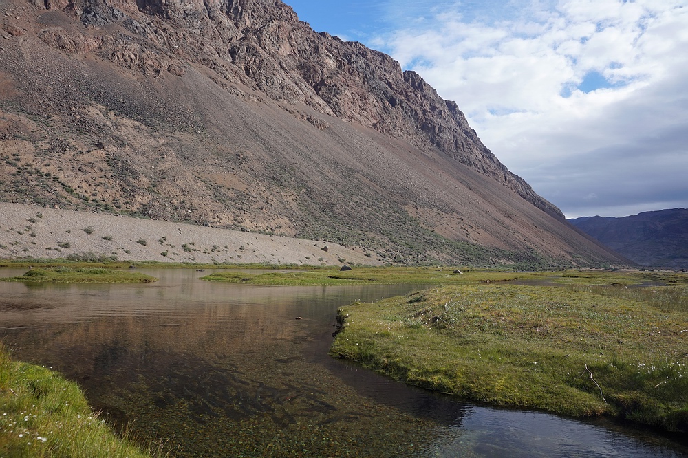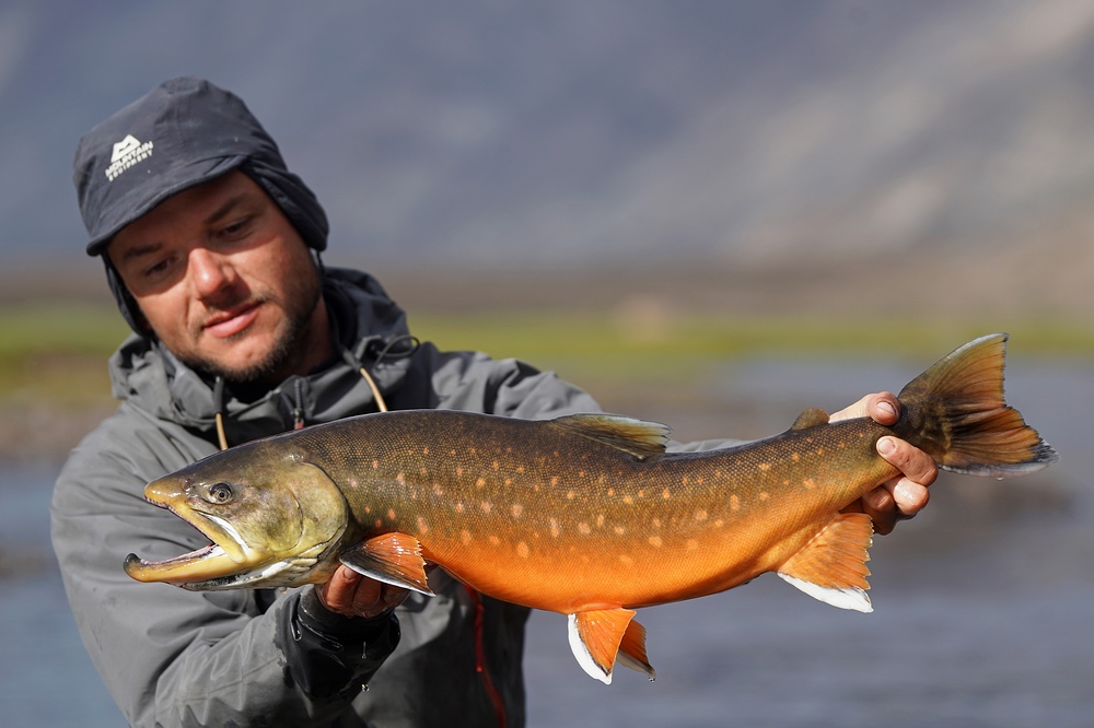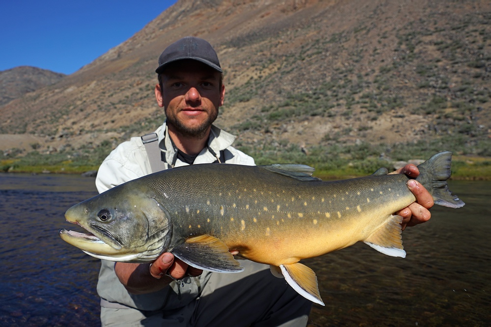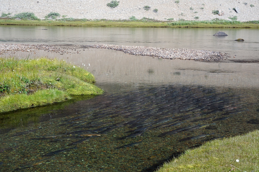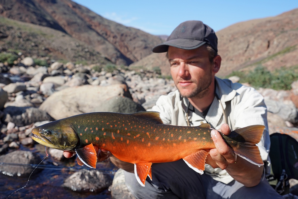 | Spannend, ob Wandersaiblinge, also die anadrome Form des Arktischen Saiblings (Salvelinus alpinus), diesen „neuen“ Landstrich schon besiedeln konnten. Eigentlich kann man sich fast nicht vorstellen, dass sie den Fluss durchschwimmen können, den wir entlang marschieren. Denn dieser ist nicht nur trüb und eiskalt, sondern auch äußerst steil und wild. Doch tatsächlich, in einer seen-artigen Weitung sehen wir vereinzelt Fische steigen und fangen am Abend einen Saibling. Und zwar ein knapp 50 cm großes, silbriges Exemplar, bei dem es sich nicht um einen im Süßwasser abgewachsenen Fisch handelt, sondern der offensichtlich frisch aus dem Meer aufgestiegen ist! Zwei Tage später und viele Katarakte höher können wir sogar im letzten Gletschersee am Talschluss noch kleine Saiblinge beobachten. Solche Erkenntnisse sind auch deshalb interessant, weil man hier quasi in Zeitraffer nachvollziehen kann, wie auch die nacheiszeitliche Besiedelung unserer heimischen Alpenseen durch Fischarten wie den heutigen Seesaibling von statten gegangen ist. Man darf das Ausbreitungspotential dieser Fische offensichtlich keinesfalls unterschätzen! |