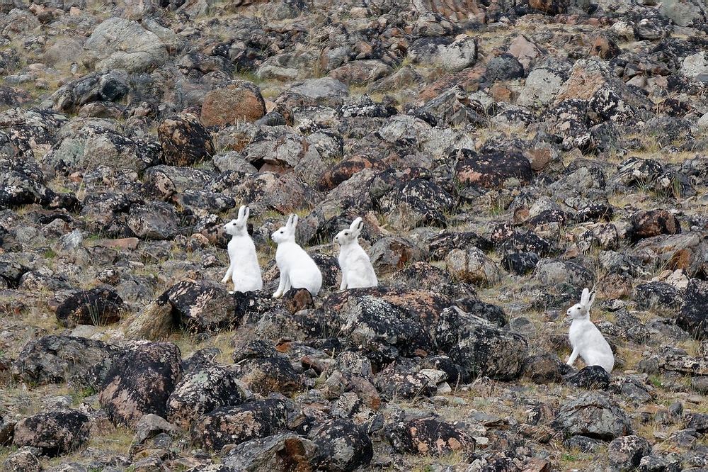 Im Gebirge begegnen wir Schneehühnern und Schneehasen. Es mutet schon sehr skurril an, diese im Winter schneeweißen, jetzt im Sommer schmutzig weißen Tiere auf dem braunen oder grünen Fels- und Grasgrund der Gebirgstundra sitzen zu sehen. Nach zwei Wochen Nudeln und Fisch wären uns die schönen Hasen nicht nur als Fotomotiv sehr willkommen, sondern auch als Mahlzeit. Leider findet sich keine „Karotten-Fliege“ in der Schachtel, sodass wir zu primitiveren Methoden greifen. Zuerst werden die nicht allzu scheuen Tundrenhoppler mit dem Teleobjektiv verfolgt. Ist ein gutes Foto im Kasten, folgt zum Dank ein Steinhagel. |