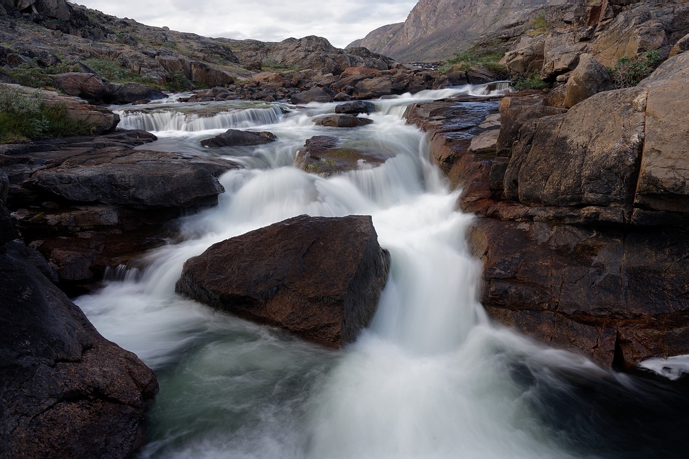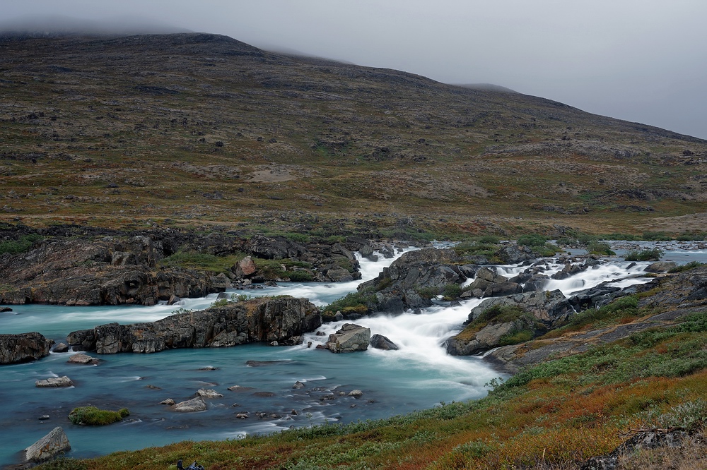 brausenden, tiefgrauen Sarfartoq mischen sich die beiden Wässer in