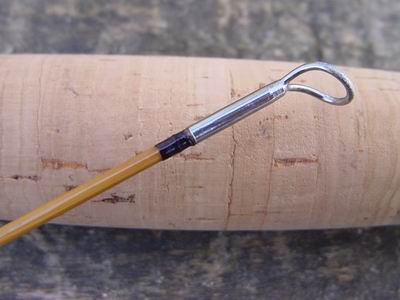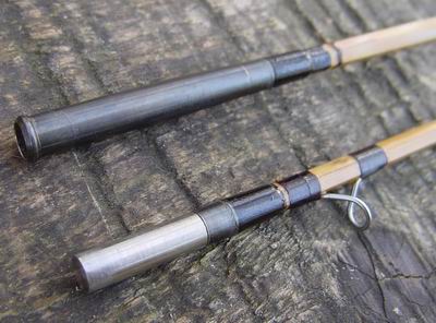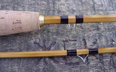 Sehr schlanker, farblich naturbelassener, glanzlackierter Sechskant-Hohlspleiß- Tonkin-Blank mit paarweise versetzten Knoten und dezenten Flammpunken. Die Ringbindungen wurden mit Laminierharz behandelt, die Rute wurde zwei mal tauchlackiert. Die beiden Rutenteile werden mit einer, mit Lamellen versehenen, bünierten Nickelsilberhülse zusammengesteckt. Beringung: Handteil mit einem Dreibeinring mit Keramik-Futter und einer feststehenden Fliegeneinhängeöse über dem Griff, Spitzenteil mit sechs Schlangenringen und dem Spitzenring. Alle Ringe besitzen der Schnurklasse angemessene geringe Durchmesser & |