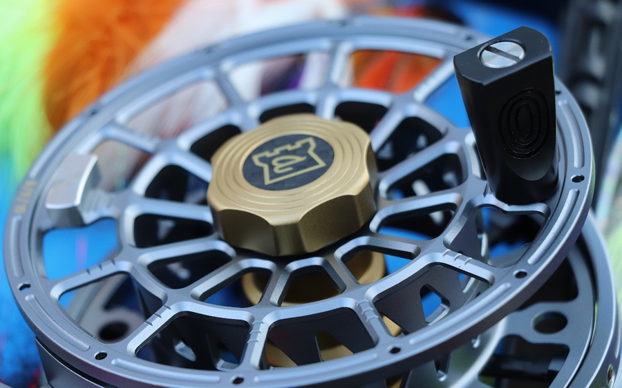 Schöne und für ihre Größe leichte Großkern Fliegenrolle aus Aluminium, in sehr moderner, ansprechender Optik. Aus Barstock 6061-Aluminium gedreht und gefräst und mit salzwasserfester Eloxal-Finish Oberfläche in dunklem "Titan" versehen. Mit Elementen aus Kohlefaser - siehe dazu weiter unten. Bremseinstellrad, Bremszylinder, Achsensystem und Spulenmutter kommen farblich abgesetzt in dunklem Goldton. Die Spule läuft auf einem großkalibrigen Achsensystem perfekt rund im offenen Rollenrahmen, die gehäuseseitige Platzausnutzung ist gut. Die Rollenrückseite ist bis auf sechs verschraubte Kohlefaserstege, welche mittig die Achse und das Bremssystem tragen, vollständig offen gestaltet. Auf den ersten Blick eine mutige Konstruktion für die oberen Schnurklassen, denn gerade beim tropischen Salzwasserfischen mit entsprechend "aggressiven" Bremseinstellungen, wo im Drill ernsthaft hohe Kräfte auf Rollenrahmen und Achse wirken, kommt die Frage auf, ob es wirklich sinnvoll ist, den Alurahmen zu unterbrechen und durch seitlich eingesetzte Kohlefaserstege zu ersetzen. Aber die Tests konnten uns vom Gegenteil überzeugen: auch bei großen anliegenden Zugkräften verformen sich Stege, Rahmen und Achse nicht nachteilig, was sicher auch an der massiven Verschraubung mit durchgehenden Stahlstiften liegt. Die Spulenseiten wurden zur maximalen Ventilation beidseitig und durchgehend durch ein Stegsystem offen gestaltet. Der Spulenboden wurde ebenfalls maximal ventiliert und besitzt zweireihig dreieckige Lochungen. Der offene Spulenkern kommt wie die Spulenseiten offen mit Stegsystem. Seitlich am Gehäuse befinden sich zwei Stege: hinten der Steg für den zweifach von Außen angeschraubten Rollenfuß, vorne mittig ein abgerundeter Steg für die Schnurführung, mit Langlochung und konisch verlaufenden Verbindungen zum Gehäuse. |