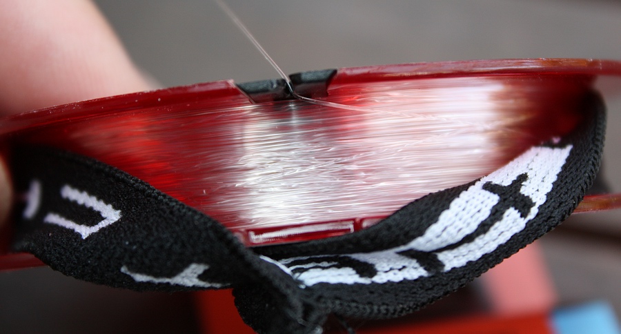 mit Halteclip und mit einem elastischen Sicherungsband, welches das Vorfachmaterial