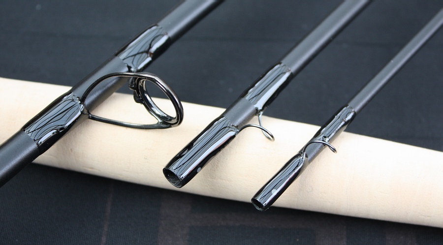 Die vor uns liegende Helios 2 Covert Black wirkt mit ihren komplett in Schwarz gehaltenen Farbtönen erstklassig abgestimmt und wie aus einem Guss. Die Ausstattung erfolgte durchweg mit herausragend hochwertigen, der Preiskategorie würdigen Komponenten und die Verarbeitung der gesamten Rute ist absolut makellos. Der Korkgriff aus 6mm-Scheiben in feinster Qualität ist für diese hochkarätige Fliegenrute absolut angemessen (großes Lob!), er liegt mit seinen Dimensionen sehr gut in der Hand. Der griffwärts wirkende, sehr leichte, schwarze Alu-Schaubrollenhalter passt ausgezeichnet zur Rute, funktioniert leichtgängig und hält die Fliegenrolle fest und sicher. Zusammengesteckt wird die H2 Covert mit ausgezeichnet passenden und daher die Einzelteile sehr sicher zusammen haltenden Überschubverbindungen. Beidseitige, kleine Punktmarkierungen in dezentem Hellgrau erleichtern das Ausrichten beim Zusammenstecken der einzelnen Rutenteile. |