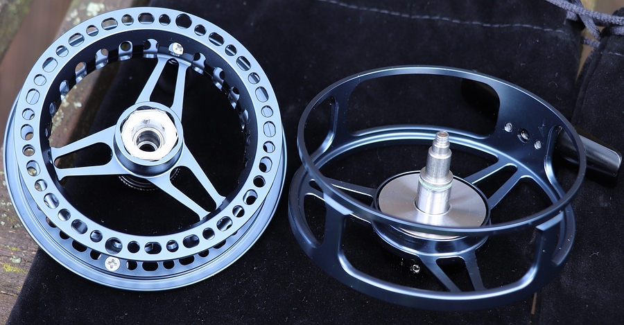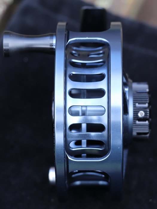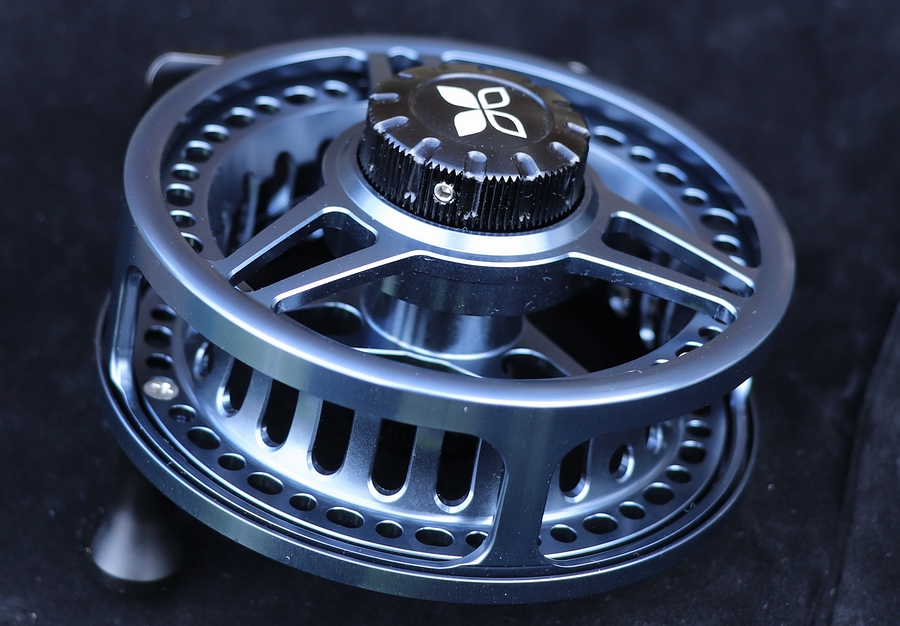 gefräste und eloxierte Fliegenrolle besitzt ein cooles, metallic-blaues