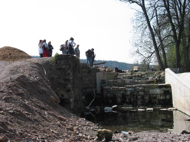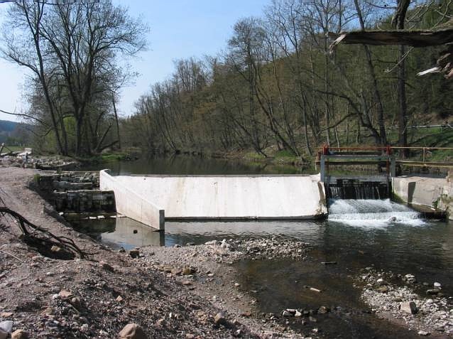 Das Wehr wurde neu errichtet, nachdem das alte vor zwei Jahren nach Eisgang und Hochwasser gebrochen war. Dazu hatte das Landratsamt in Apolda im Jahr 2002 eine Baugenehmigung erteilt. Ein wichtiger Punkt dabei war der Bau einer funktionstüchtigen Fischtreppe. Entgegen dieser Baugenehmigung hatte das Staatliche Umweltamt Erfurt im Dezember 2003 einer bis Mitte März 2004 befristeten Inbetriebnahme zugestimmt, obwohl weder die Fischtreppe funktionierte noch Maßnahmen zur Sicherung von einem Mindestwasserstand in der Ilm getroffen worden waren. Eine Sehenswürdigkeit der besonderen Art: Die verlassene Baustelle an der halbfertigen Fischtreppe. Auch dem fischereilichen Laien wird sofort klar, dass Fische ohne übernatürliche Fähigkeiten an dieser Stelle keine Chance haben. |