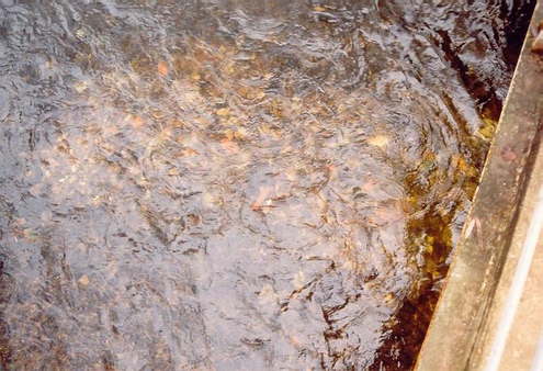 am Rechen vor der Wasserkraftanlage, die kleineren werden hindurch schwimmen.