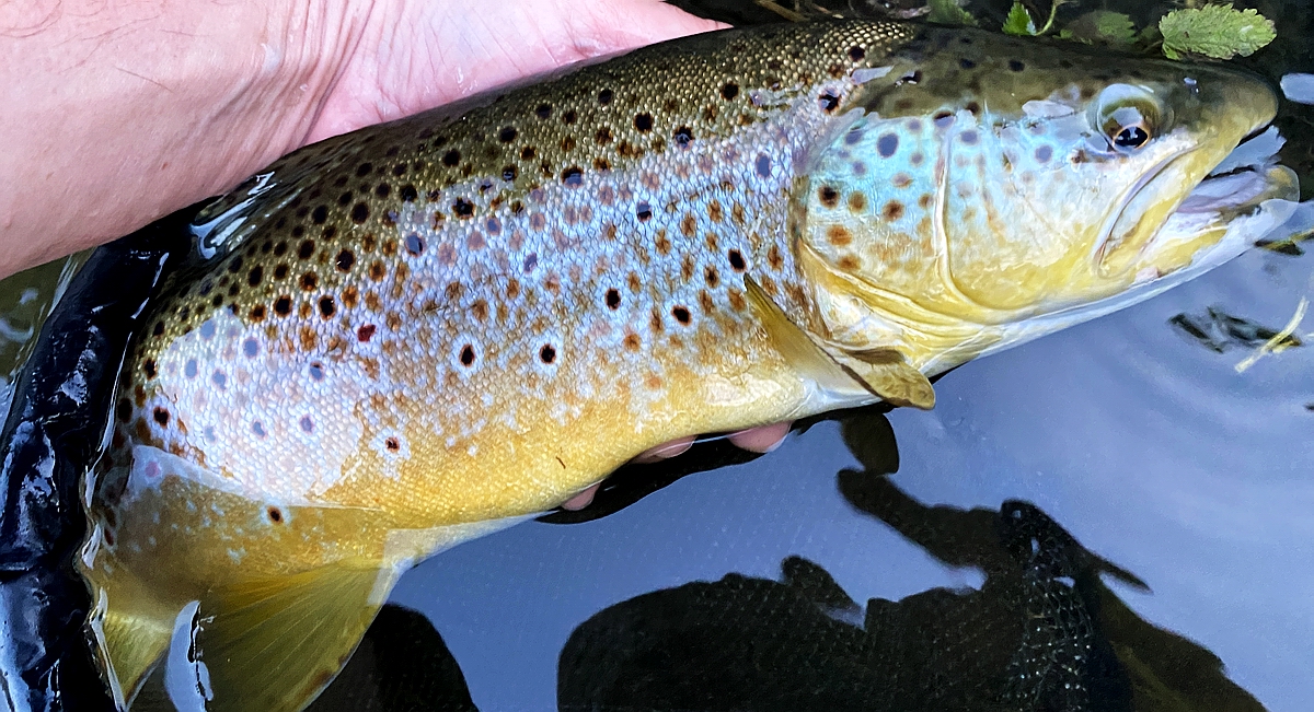 Bachforellen im Fluss. Diese hier hat einen "Reiherstich" auf dem Kopf