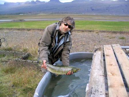 Schon am ersten Abend bestätigte sich dies auch. Bereits am zweiten Pool fing ich meinen ersten Grilse. Er war silberblank, hatte aber keine Meerläuse mehr. Das war aber noch nicht alles. An diesem Abend ging mir noch der grösste Fisch der Woche an den Haken, 10 Pfund schwer. Diesen Fisch stellte ich dann auch Thosturs Smolt Programm zur Verfügung. Der Lachs wird hierfür in ein am Fluss aufgestelltes Basin gebracht und im Oktober abgestreift. So soll garantiert werden, daß mit flusseigenem Genmaterial besetzt wird. Am zweiten Tag konnte ich vier schöne Grilse fangen und an meinem Abreisetag noch einen Grilse. Alles, bis auf den 10 Pfünder, schöne blanke Fische. |