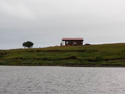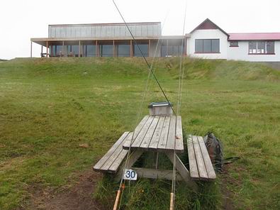 Während der Fischerei herrschte immer Wind und peitschender Nieselregen - das ist Iceland - … Bernhard und ich beendeten glücklich unseren halben Fischereitag an der Rangá und fuhren mit dem Auto zurück an die Fischereistelle LAX-Á, um die Fänge ins Fangbuch einzutragen. Danach machten wir uns frisch fürs Abendessen, 3 Gänge Menü, eine Flasche Wein für die Feier des Tages und als „Betthupferl“ ein Gläschen Whisky. |