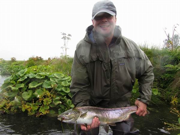 Stóra Laxá Beat 2 von 7.00 bis 13.00 Uhr, ein wunderschöner Canyon und mittendrin stehen Bernhard und ich, ein überwältigender Anblick, den kein Foto zeigen kann. Habe 3 Würfe gemacht und die Rute war krumm, ein schöner, bereits gefärbter Milchner, leider hatte er die Fliege regelrecht inhaliert. Entnahme da der Fisch blutete. |