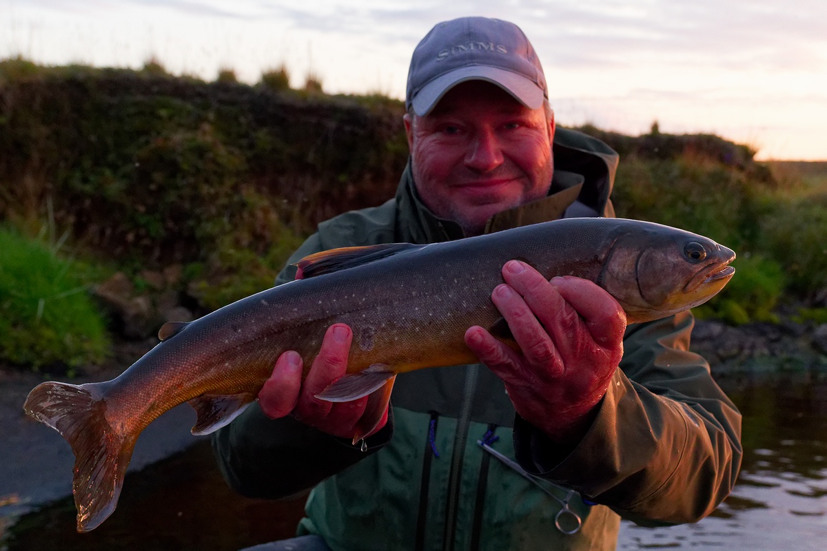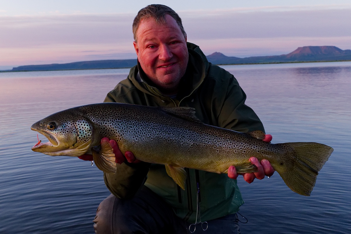Anschließend versuchten wir es wieder weiter draußen im See auf Forellen, diesmal allerdings erstmal mit den 6er Ruten, mit denen wir auf Saiblinge gefischt hatten. Bei mir kam eine „Krókurinn“ zum Einsatz, Manfred band einen kleinen Kettenaugenstreamer mit Grizzly-Hechel ans Vorfach. Er hatte dann auch schnell den ersten Biss und konnte nach einem kurzen Drill eine Forelle mit knapp 50 Zentimetern und einem guten Kilo landen, bei der es sich wohl um eine Meerforelle handelte. |