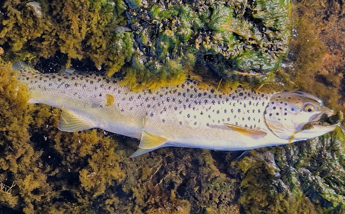 und konnte dort auch einen Grilse entdecken, der zuerst gemütlich