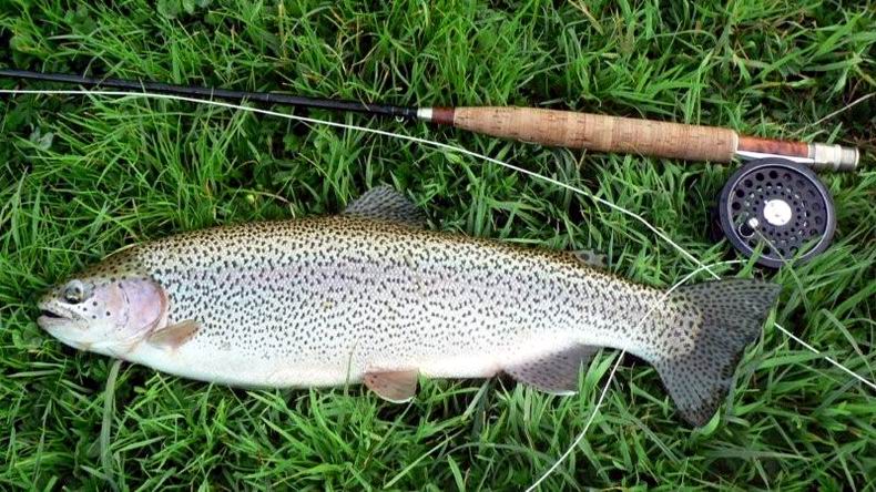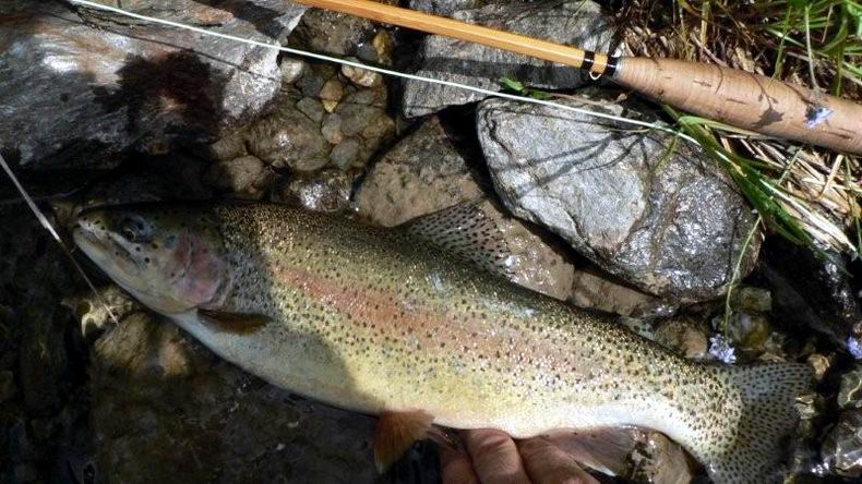 Teilweise kann man Fische durch die Drift einer Trockenfliege über eine tellergroße glatte Wasserfläche zwischen zwei Strömungen zum Steigen bewegen. Die Fliegenmuster sind eher zweitrangig, sollten aber für Fisch und Fischer gut zu sehen sein. In der Regel zaudert ein Fisch nicht lange, sondern packt zu. Hier war die Fischerei eigentlich am Erfolgreichsten, da sich die Fische eine lange „Inspektion“ der Fliege gar nicht erlauben können. Aus diesem Grund habe ich meine größten Fische auch in diesem Streckenabschnitt fangen können. In oder vielmehr neben diesem oberen Streckenteil befindet sich auch der schon erwähnte See, der einen aufregenden Fischbestand beherbergt. Man sieht große Regenbogenforellen umherziehen und gelegentlich nach einer Fliege oder Nymphe schnappen. |