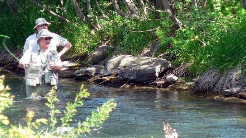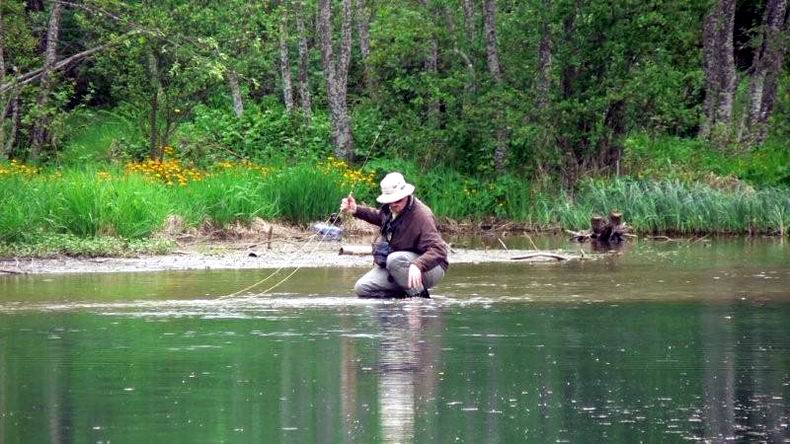 Unten: der Hausherr zeigt im unteren Streckenbereich, wie man auf die Fische hinter den strömungsbrechenden Steinen fischt |