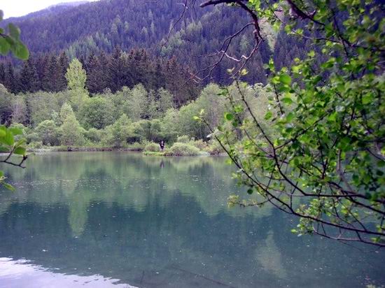 Gastkarten für die kleine Drau, Informationen zur Fischerei und Reservierungen: Anton Calovi Sillian 201j A-9920 Sillian Tel.: +43(0)4842/6594 Fax DW 15 a.calovi@aon.at www.sillian.com/hauspichler/ flyhomepage.htm Gerät: Fliegenruten der AFTMA Klasse 4-5 in 7’ bis 8’ Fuß sind völlig ausreichend, um den kleinen Bach zu befischen. Für den See oder für das Tipfischen auf scheue Großforellen wäre auch ein längere Rute in 9’ Fuß eine Alternative. <= Die Landzunge im See, eine der beiden Stellen, von wo aus man gut werfen kann. |