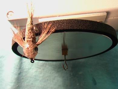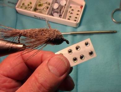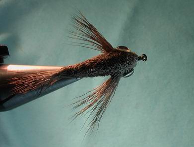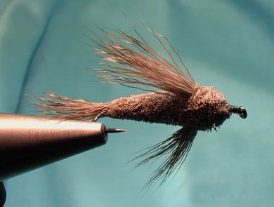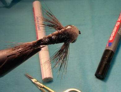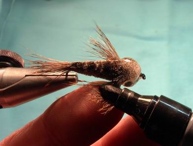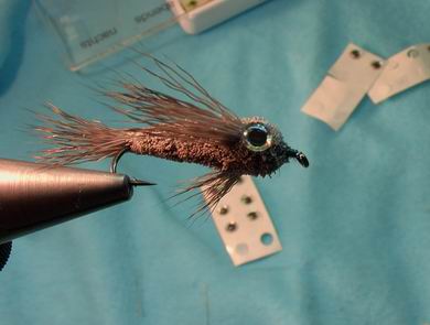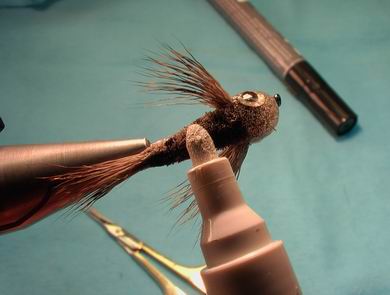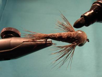 Man könnte auch auf des Klemmblei verzichten, muss dann allerdings den Haken selbst mit etwas Blei beschweren, da der Fischkörper einen großen Auftrieb hat. Zusätzlich erweist sich das Aufbringen des Rehhaars auf diese Bleiwicklung als äußerst schwierig. Jedoch erleichtert es das Werfen ungemein, wenn die Koppe nicht selbst beschwert ist. |