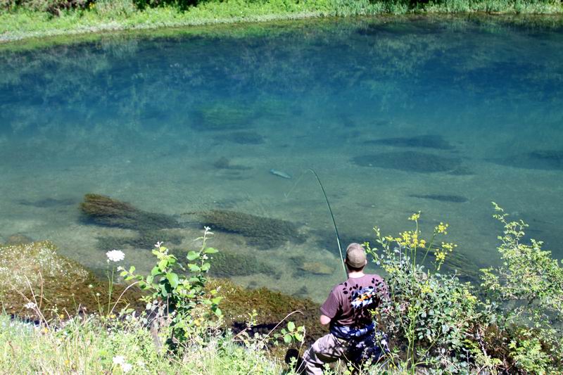 aus der Krušnica in Frage. So bleibt eine Reinerhaltung des Bestandes gewährleistet. Fänge von Bachforellen mit bis zu 20 Pfund sind in der Krušnica glaubhaft belegt und Tauchgänge meines Freundes Ani belegen dies und den Fischreichtum der Krušnica. So gibt es gigantische Äschenschulen und kapitale Bachforellen sowie vereinzelte Huchen, die aus der Una heraufziehen um in der Krušnica zu fressen. |