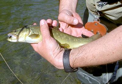 Hier schlängelt sich der Fluss durch ein schönes Tal und es wechseln sich flache und breite Riesel- strecken mit tiefen Pools ab. Mit kleinen CDC-Fliegen in grau und oliv konnten wir hier einige schöne Äschen überlisten und aus dem Schatten der überhängenden Bäume mit der Reehaar-Sedge oder schwarzen Käferimitationen auch einige Bachforellen hervor locken. Eine schöne Rotgetupfte |