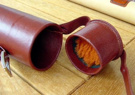 | Wesentlich preisgünstiger, aber dafür auch viel nüchterner ausgestattet, kommen die Leder-Rutenrohre der italienischen Firma POZO' zu uns. Diese Rohre besitzen ein sehr stabiles und druckunempfindlicheres PVC-Innenrohr. Die Außenhülle besteht aus (welchem?) Leder, erhältlich in einem sehr hellen und einem dunklen Braunton. Alle Nähte wurden im Doppel-Kreuzstich ausgeführt. Einen Tragegriff oder Gurt gibt es bei unseren Testmodellen mit Innendurchmesser 4,5 cm nicht, jedoch eine beweglich angenietete Verschlußkappe mit Druckknopf. Der 2005er Katalog zeigt jedoch ein Modell mit zusätzlichem Tragegurt, so dass wir davon ausgehen, dass alle Modelle ab 2005 mit einem solchen ausgestattet sind. Im Zweifelsfall anfragen. Die Rohre werden in Italien auf Bestellung in jeder gewünschten Länge angefertigt. Unser Fazit: Edel schlicht und stabil, sehr schön! | ![]() |