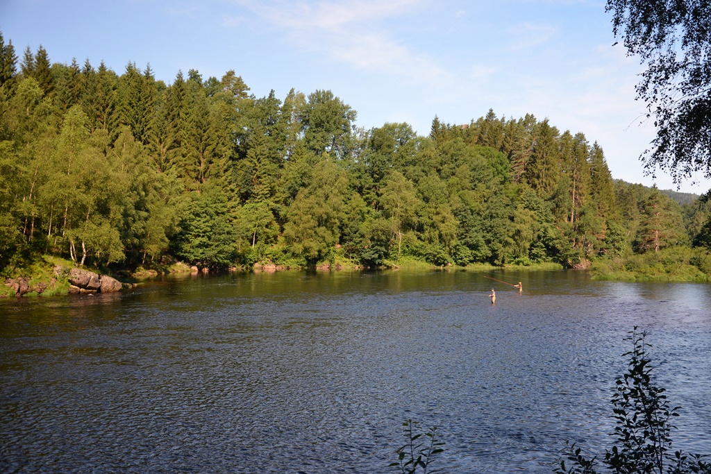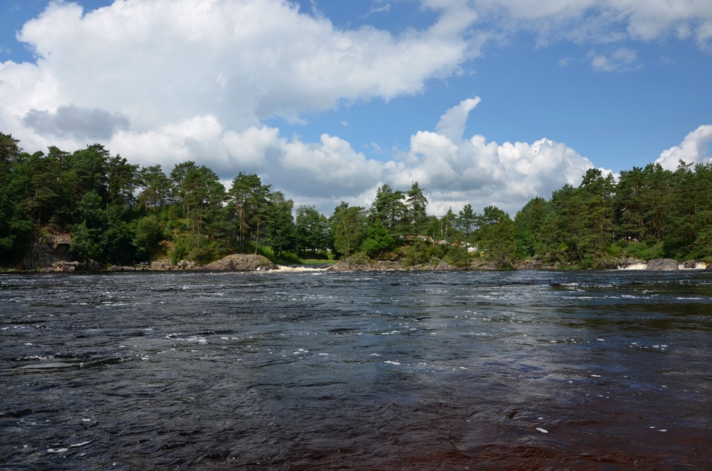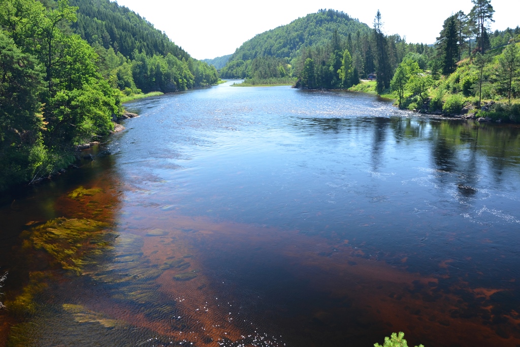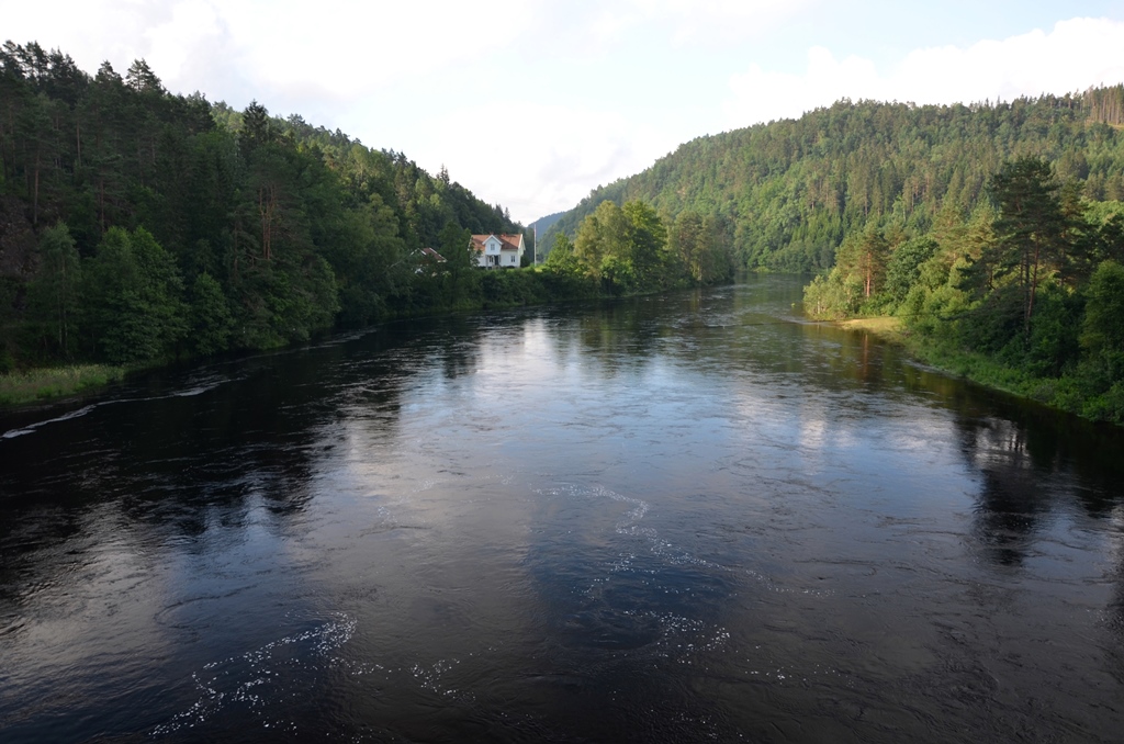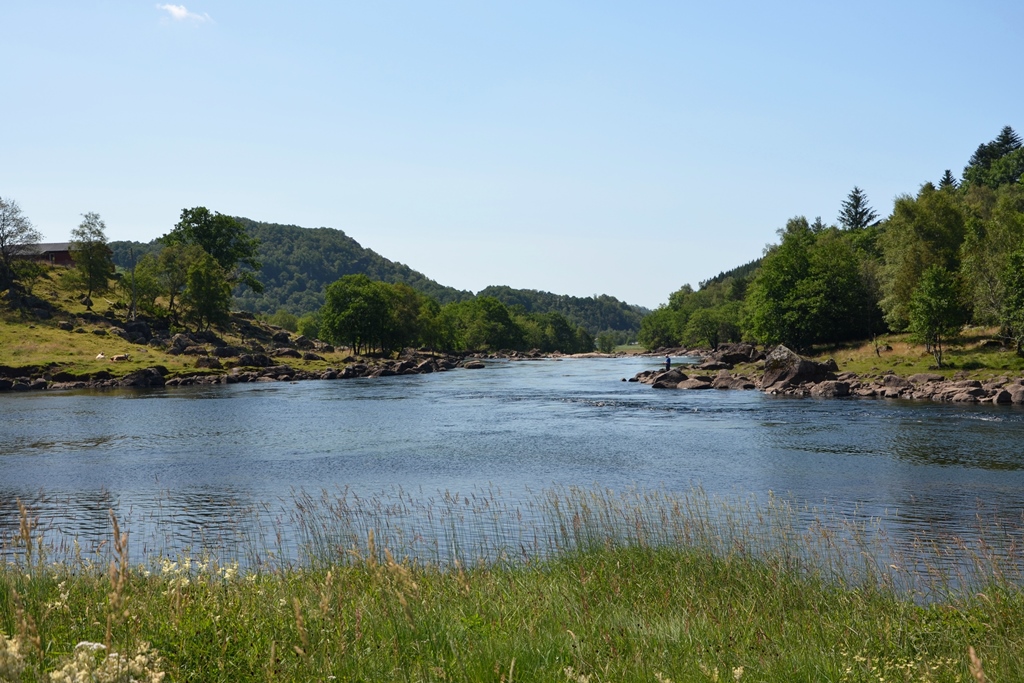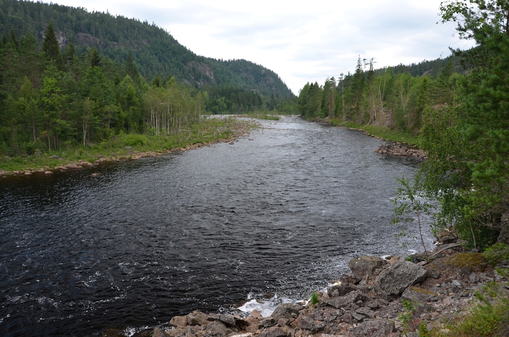 Flussauf bei Øyslebø. Immerhin sehen wir einen Lachs springen.