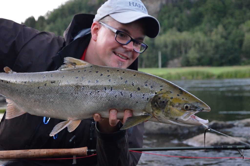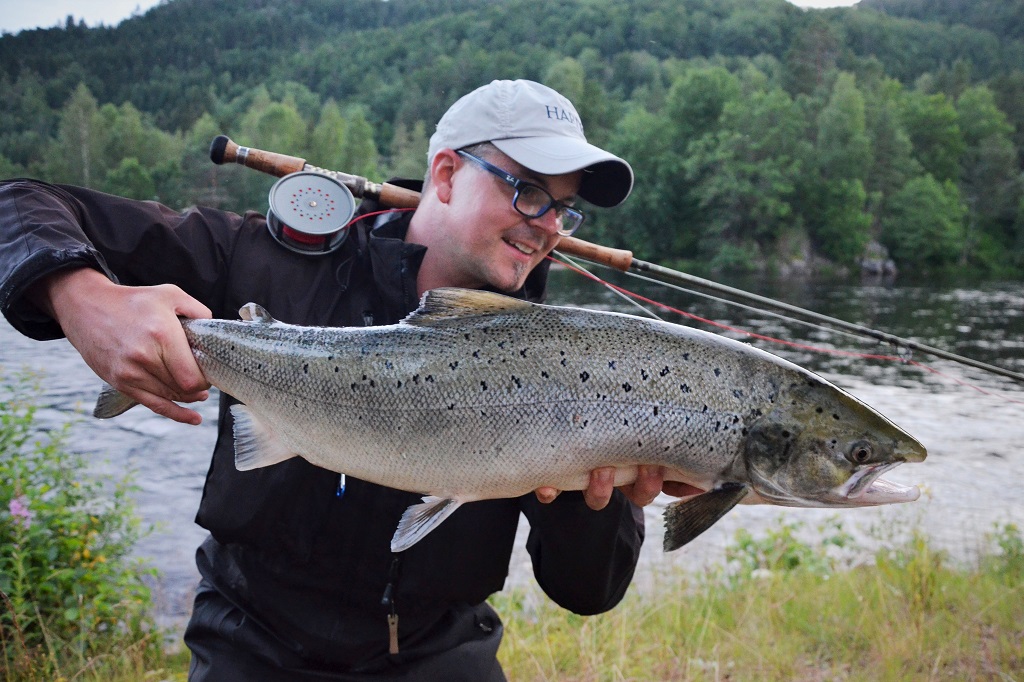 Gegen 18:00 Uhr landete ich in Kristiansand. Bis zum Mandal fährt man dann noch etwa eine Stunde. Dunkle Regenwolken hingen an diesem Abend tief zwischen den Bergkämmen. Der meiste Regen war bereits in den letzten Tagen gefallen und jetzt rauschten wilde Sturzbäche die Berge herab – ein tolles Naturschauspiel. Das stimmte mich optimistisch für die bevorstehende Fischerei. Allerdings: Der viele Regen hatte den Mandal auf beachtliche 180 m3 anschwellen lassen! Nach einer späten Gerätedesinfektion waren gegen 21:30 Uhr endlich die Hütte bezogen, der Schlafplatz bereitet und zwei Ruten montiert. Ich wollte unbedingt noch an diesem Abend eine Fliege wässern… Lachstagebuch 8. Juli: Nach Ankunft abends schnell noch raus – bei fast 180 m3! Trotzdem wähle ich den Floating Head, da das Wasser an der Stelle meiner Wahl glatt und nicht zu tief fließt. Hüfttief im dunklen Wasser stehend mache ich die ersten Würfe. Nach nicht mal 15 Minuten und vielleicht 25 Metern Fischstrecke rummst mir der erste Lachs der Tour rein! Nach einem kurzen, kräftigen Fight kann ich ein stattliches Männchen von 76 cm und 3,6 kg keschern. Was für ein Start! Später zurück an der Hütte erfahre ich von zwei weiteren gelandeten und einem verlorenen Fliegenlachsen bei Kollegen heute. Der Abend wird lang: ich sitze bei einem Angler-Pärchen aus Stavanger bis spät nachts vor deren Hütte, erzähle Geschichten und trinke Bier. |