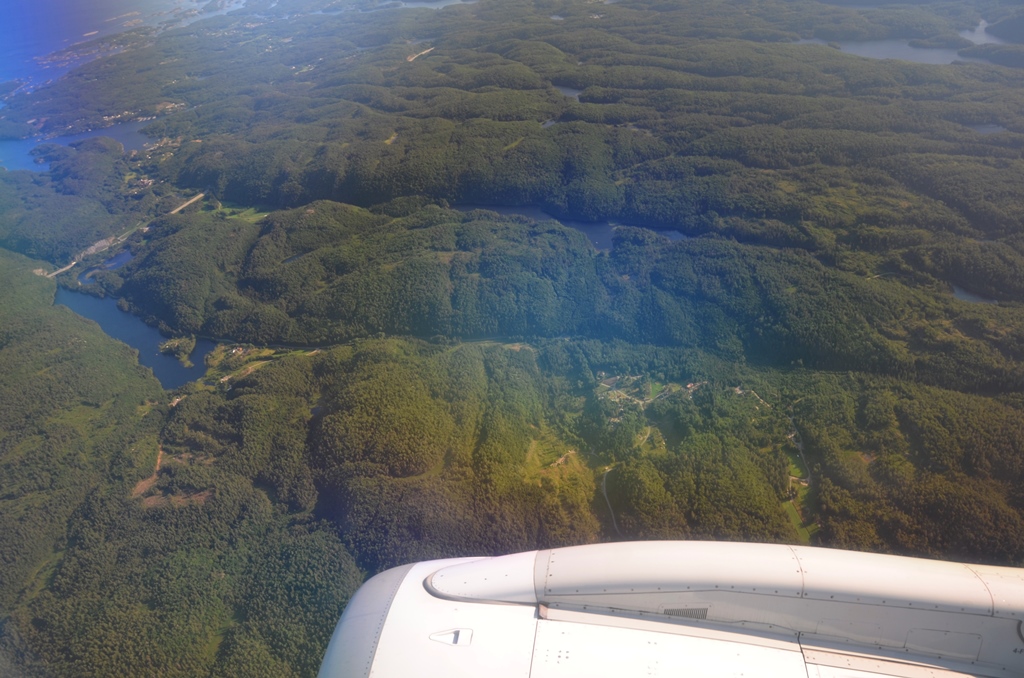 beginnt. Steigflug über der südnorwegischen Hügel- und Waldlandschaft