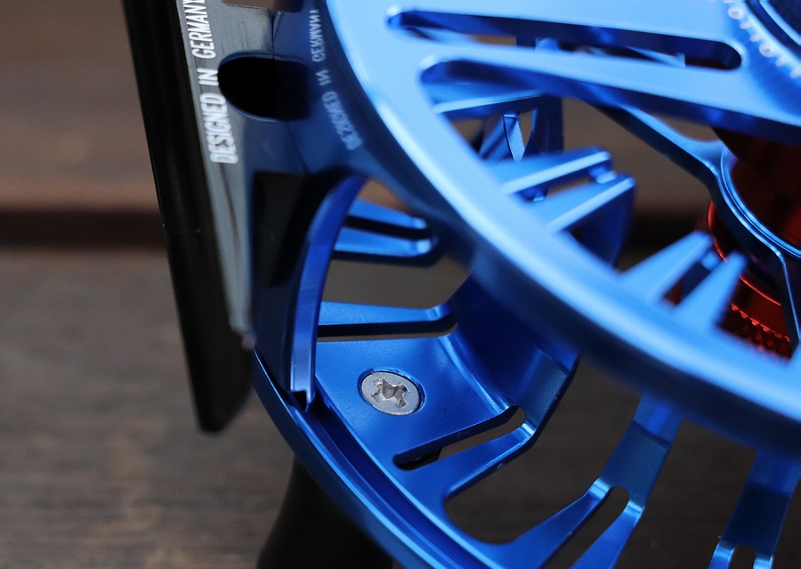 (eigene Messungen) Farbe: Blau/Rot Gewicht: 182 Gramm (Rolle), 62 Gramm (Spule allein) Rollendurchmesser: 106 mm Rollenbreite (ohne/mit Kurbel u. Bremsrad): 37 (73) mm Spuleninnenbreite: 28 mm Spulentiefe (nutzbar): 21,6 (18) mm Spulenkerndurchmesser: 64 mm Schnurfassung: WF8F + über 250 m 20 lbs Backing Schnuraufnahme mit einer Umdrehung bei voller Spule: 30 cm Lieferumfang: Karton, Neopren-Rollentasche Garantie: 25 Jahre Warrenty auf Herstellungs- und Materialfehler für den Erstbesitzer (für Details siehe Marlo Homepage) Seriennummer: nein Preise: Rolle: 360,00 € | E-Spule: k.A. Beschreibung und Praxistest: Moderne Großkern- Fliegenrolle aus CNC-gefertigtem Aluminium und Edelstahl, die sehr glatte Oberfläche wurde hartanodisiert. Reflexionsarm matte Farbgebung. Die beidseitig und im Spulenboden durchgehend mit großen und kleinen Langlöchern versehene Spule läuft mehrfach gelagert sehr solide auf einem starken Achsensystem und im offenen Rollenrahmen. Der Spulenkern besitzt drei filigrane Doppelstege. Die Gehäuserückseite wurde bis auf einen durchgehenden, langgelochten Steg weitgehend offen gehalten. Der Rollenrahmen wird seitlich von zwei Stegen gestützt: ein schmaler für die Schnurführung und ein breiterer für den zweifach von Innen geschraubten Rollenfuß (nicht durchgehende Bohrlöcher). Durch die toleranzarme Bauweise ist ein seitliches Entweichen von Fliegenschnur oder Running Line weitgehend ausgeschlossen. Auf der Spulenvorderseite befindet sich eine gut dimensionierte, leicht und spielfrei laufende Kurbel aus Kunststoff und dieser gegenüber ein rundes Kontergewicht. Die gehäuseseitige Platzausnutzung ist sehr gut. |