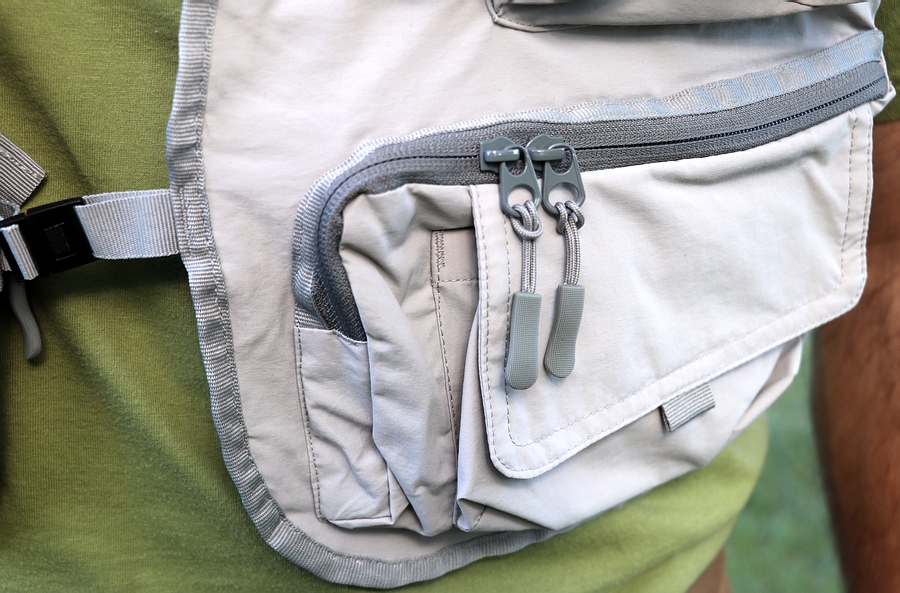 | Testeinschätzung: Einfach unglaublich, welch große Funktionsfülle in dieser leichten Weste steckt! Optisch macht sie einen sehr guten Eindruck, die Verarbeitung ist perfekt und die Passform sowie der angenehme Tragekomfort ist absolut prima! Mehr Taschen wird wohl kein Fliegenfischer brauchen (eher weniger...), auch die Taschen-Größenvielfalt und die Ausstattung derselben mit Reißverschlüssen bzw. (doppelten) Klettverschlüssen sollte jedes Fischerherz rundherum zufriedenstellen. Alle anderen praktischen Funktionsdetails (siehe lange Liste oben) wurden unaufdringlich und leicht zugänglich untergebracht. Alle Reißverschlüsse lassen sich durch Zipper komfortabel bedienen und laufen leichtgängig, alle Klappen der Klettverschlusstaschen besitzen zudem fürs bessere Handling kleine Schlaufen. |