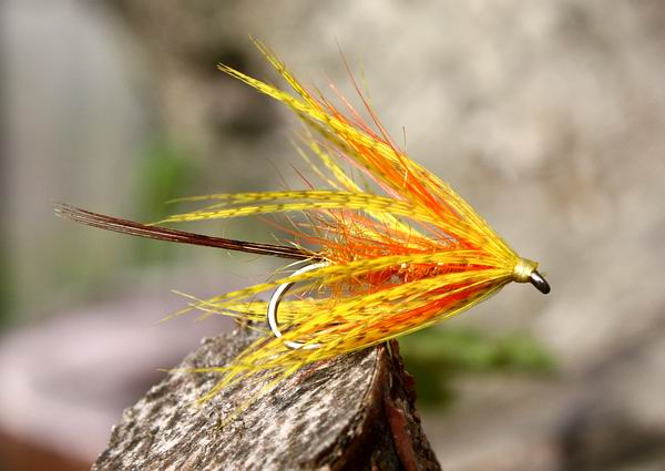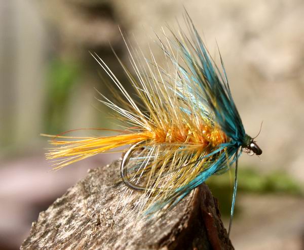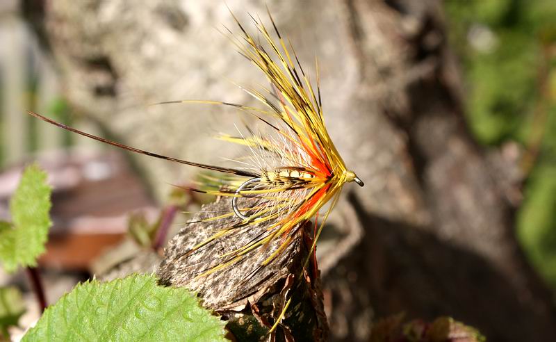 Bindeweise: Hakengröße 10, 2x lang, Fasanenschwanz (6-8 Fibern eher kurz), Körper golden- olive oder dunkelgelbes Seehundsdubbing oder Ersatz (Angora), gerippt mit mittlerem, ovalen Goldtinsel, Stützhechel Hahn oder Henne orange, Fronthechel graue oder gelbgefärbte Stockentenfeder. |