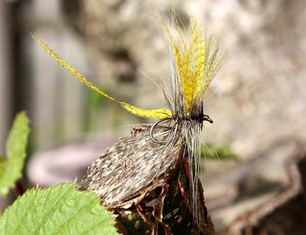 Grey Wulff und Variante in gelb Bindeweise (hier die irische Variante, speziell für den Lough Derg): Hakengröße 6, 8, leichter Nassfliegenhaken z.B. Kamasan B 170, Eichhörnchenschwanz für Schwanz und Flügel, der Flügel wird nicht geteilt, nur über dem Öhr leicht angehoben, Körper blaugraues (blue dun) oder gelb-olives Seehundsdubbing oder Ersatz dick gewunden, Hecheln blaugrau (blue dun) und ginger bzw. blaugrau und gelb (oder Grizzly gelb gefärbt). Einzeln oder zu zweit trockengefischt. Am Fluss ist die Grey Wulff in der Originalbindeweise Hakengröße 8, 10 besser. |