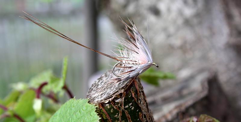 Mosely Mayfly Bindeweise: Hakengröße 8, 10, 2x lang, z.B. Kamasan B 830, Fasanenschwanz 3 4 Fibern, Körper Hare´s Ear und gelbes Seehundsdubbing oder Ersatz, 1:1 gemischt, Hecheln oliv, blaugrau und leichtes Pink, nacheinander durcheinander gewunden, die Hecheln werden unterhalb des Hakenschenkels weggeschnitten, noch besser mit einer Kreuzwicklung nach oben gebunden. Wird auf dem See oder am Fluss trocken