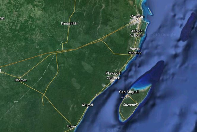 Yucatan: Nördlich Cancun, zentral gelegen Playa del Carmen vorgelagert die Insel Cozumel. Südlich geht es weiter über Akumal und Tulum bis nach Belize. Unten: Die Insel Cozumel, auf der nordöstlichen Seite der Insel befinden sich die Flats & die weitläufigen Flats im Detail |