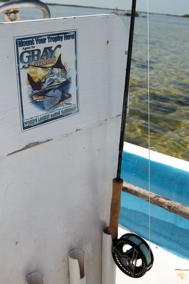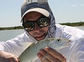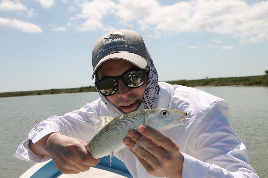 | Weiter ging es an eine tiefe, von Seegras übersäte Stelle. Es sah sehr vielversprechend aus. „Bonefish, Bonefish!“ rief Enrique auf einmal. Er hatte einen schönen Schwarm vor uns entdeckt. Ich warf die Fliege einige Male, bis sie in der richtigen Position war. Langsam und stetig, wie schon so oft an diesem Tag, strippte ich die Schnur. Auf einmal ging ein Ruck durch die Rute! Ich hob die Rute an und verspürte einen Widerstand! Der Haken saß. Die Rolle fing an laut zu surren und Sekunden später war ich schon im Backing! Nach kurzen, aber sehr intensivem Drill, hielt ich meinen ersten Bonefish in den Händen. Zwar nur ein Baby, aber hey, „bone is bone“! Die Zeit war sehr schnell vergangen und kurz darauf befanden wir uns auch schon wieder auf dem Rückweg. |