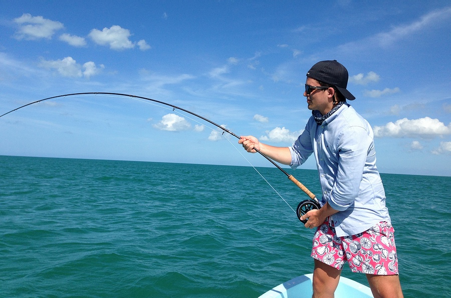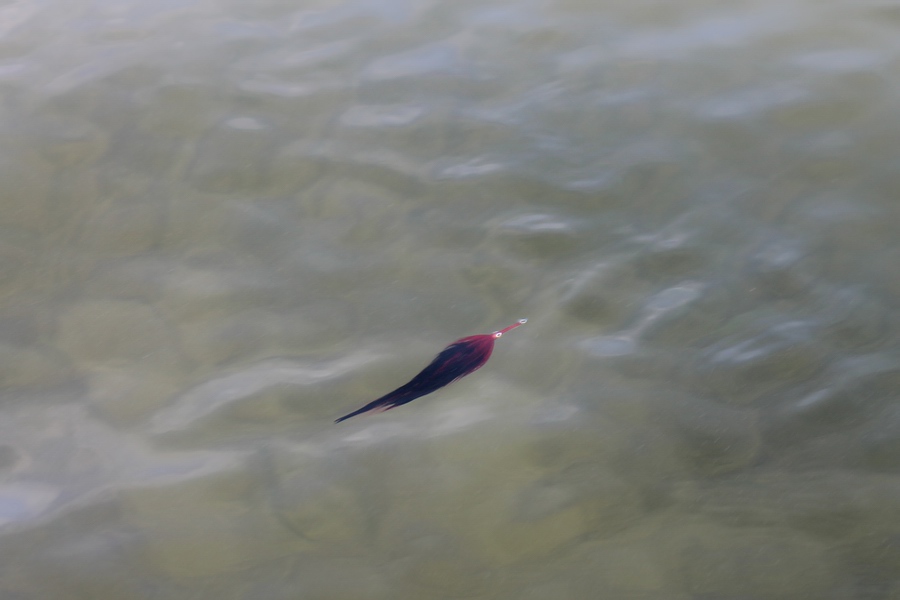 Aus rund fünfzig Meter Entfernung kam der Schwarm rasch näher. Ich warf die Rute aus und die Fliege landete rund zwanzig Meter vor unserem Boot. Perfekten Abstand zwischen Boot und den Fischen! Wie immer ließ ich die Fliege etwas absinken und schon war der erste Fisch beinahe auf Höhe der Schnur angelangt. Ich begann erneut wie wild zu strippen. Kurz darauf straffte sich die Schnur! Dieses Mal war es aber so stark, dass es mich fast vom Boot gerissen hätte! Mit viel Kraft stemmte ich mich gegen die Schnur und setzte den Haken, so gut es ging. |